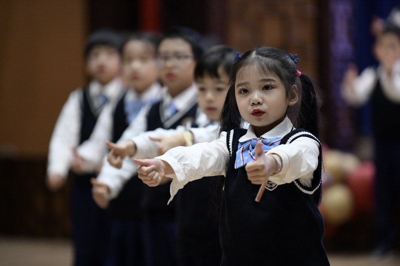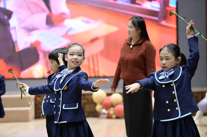 在感恩篇中,孩子們用真摯的情感表達(dá)了對老師的感激之情。在二3班的手勢舞《感謝您,老師!》中,孩子們用整齊的手勢和深情的歌聲訴說著對老師的敬愛與感謝。大屏幕滾動播放著師生相處的點點滴滴,不僅讓觀眾們感受到了師生之間的深厚情感,更讓孩子們在表演中學(xué)會了感恩和珍惜。