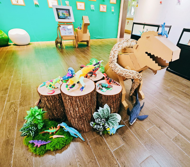 "這些恐龍都在和我說話呢!"小藝術家指著角落的副櫛龍群介紹,"它們頭頂的冠其實是立體聲音響,我在彩泥里藏了鈴鐺。"展覽中處處可見如此童趣創意:用棉花制作的火山噴發場景、錫紙折疊的史前湖泊,甚至還有橡皮章拓印的恐龍足跡小路。