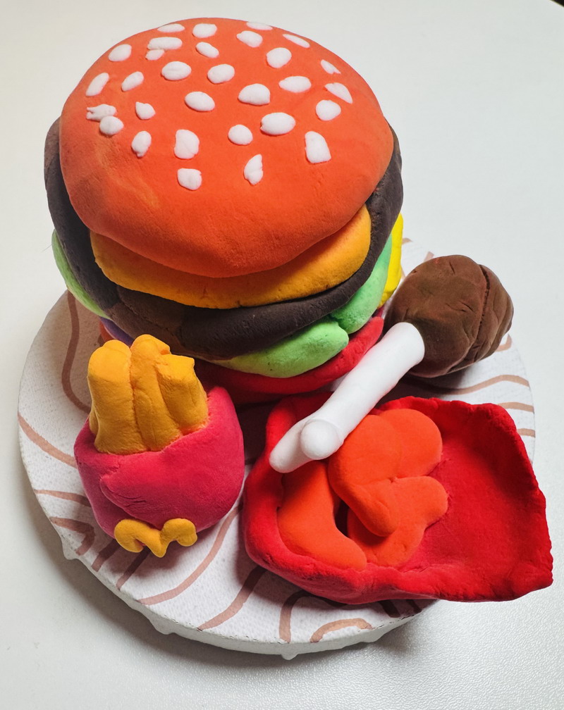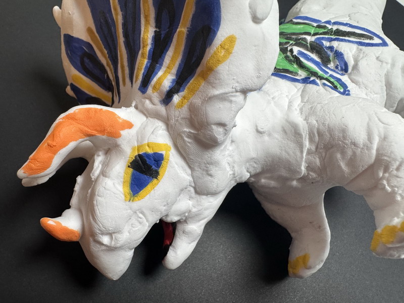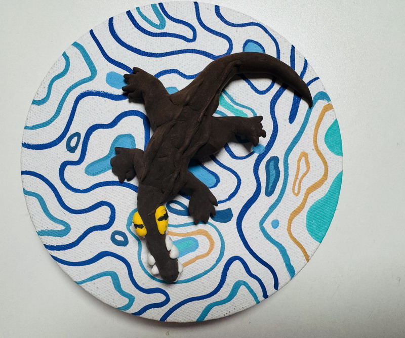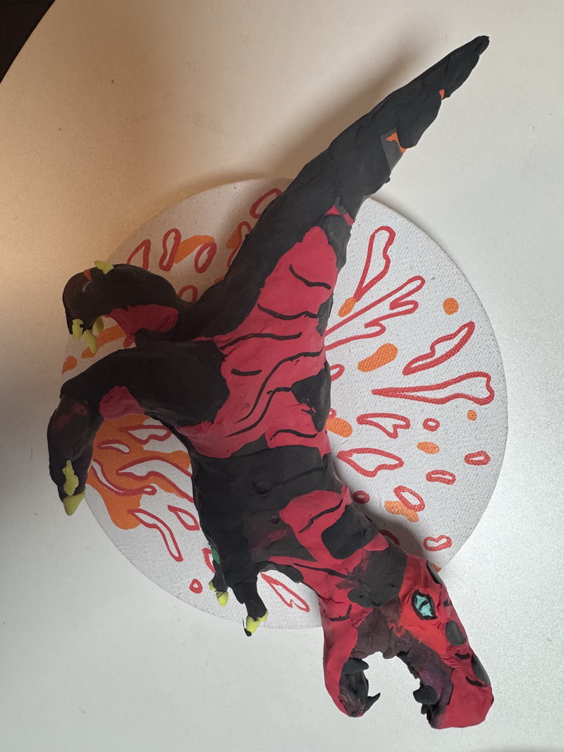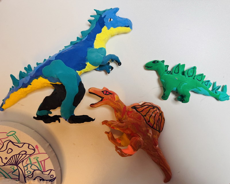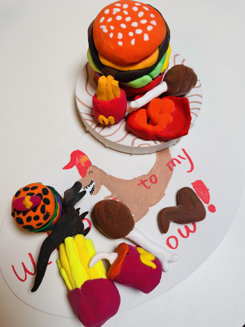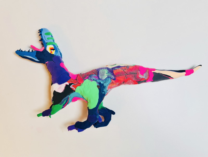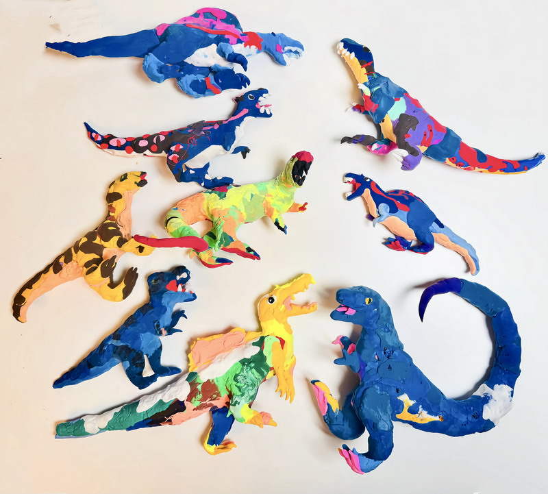 走進展區,一組紅白相間的霸王龍家族正在"圍攻"梁龍,動態造型中可見小作者對恐龍骨骼結構的精準把握;灰藍色迅猛龍群采用漸變色黏土,爪部特意用牙簽刻畫出鉤狀紋理;最引人注目的當屬1.2米長的五彩棘龍,背帆上精心鑲嵌的亮片在燈光下閃閃發光——這正是徐熙彧最鐘情的"漁夫恐龍"。