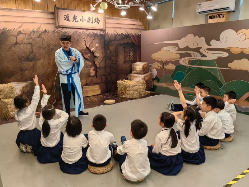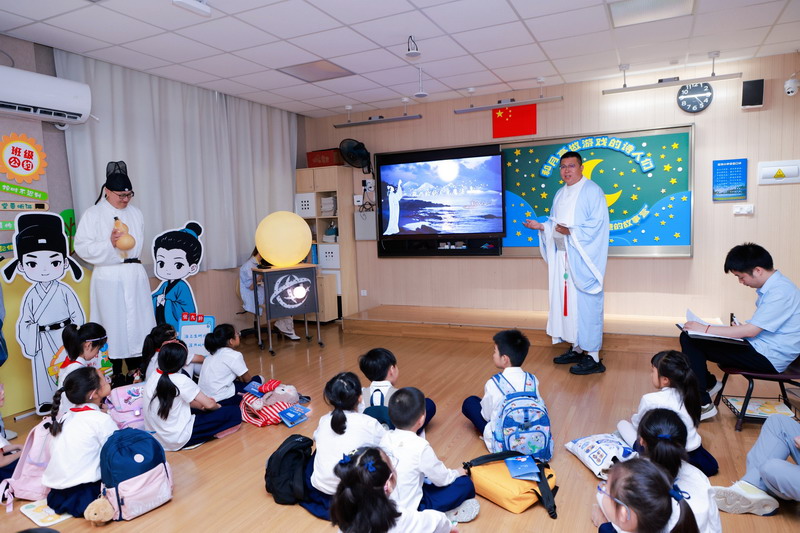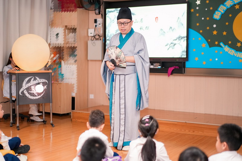 文學世界里,爸爸們化身故事魔法師。《沒頭腦和不高興》的幽默情節讓教室變成歡樂的海洋;《驕傲的將軍》的深刻寓意在孩子們心間播下謙遜的種子;《哪吒鬧海》的傳奇事件使每個孩子的眼中都躍動著勇敢的火苗;《和月亮做游戲的詩人們》的詩情畫意帶著孩子們穿越千年,在月光下與李白、王維和張九齡相遇。