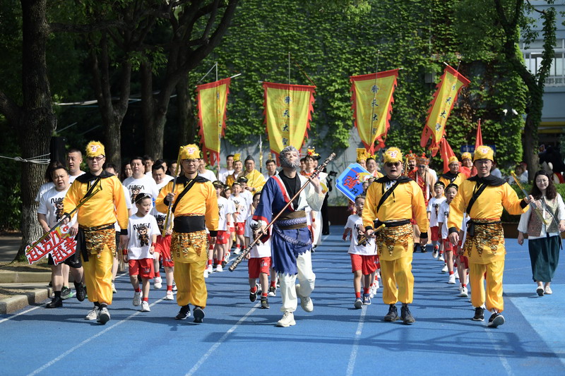 二 4 班 “西游少年團(tuán)”:爸爸們扮成唐僧師徒,孩子們化作 “小悟空”手持金箍棒,他們喊著“西游精神放光芒,二年四班當(dāng)自強(qiáng)!”的口號(hào),將團(tuán)結(jié)協(xié)作的西游精神演繹得淋漓盡致。