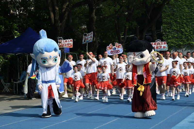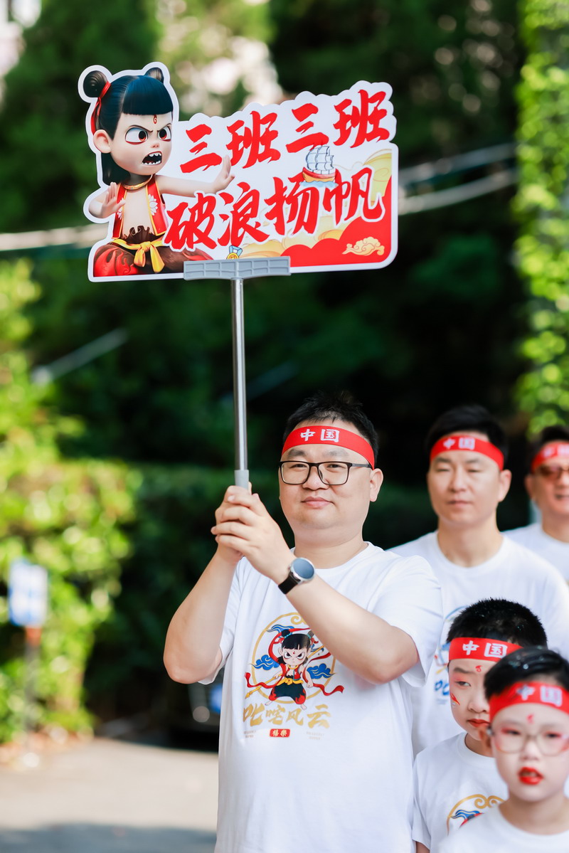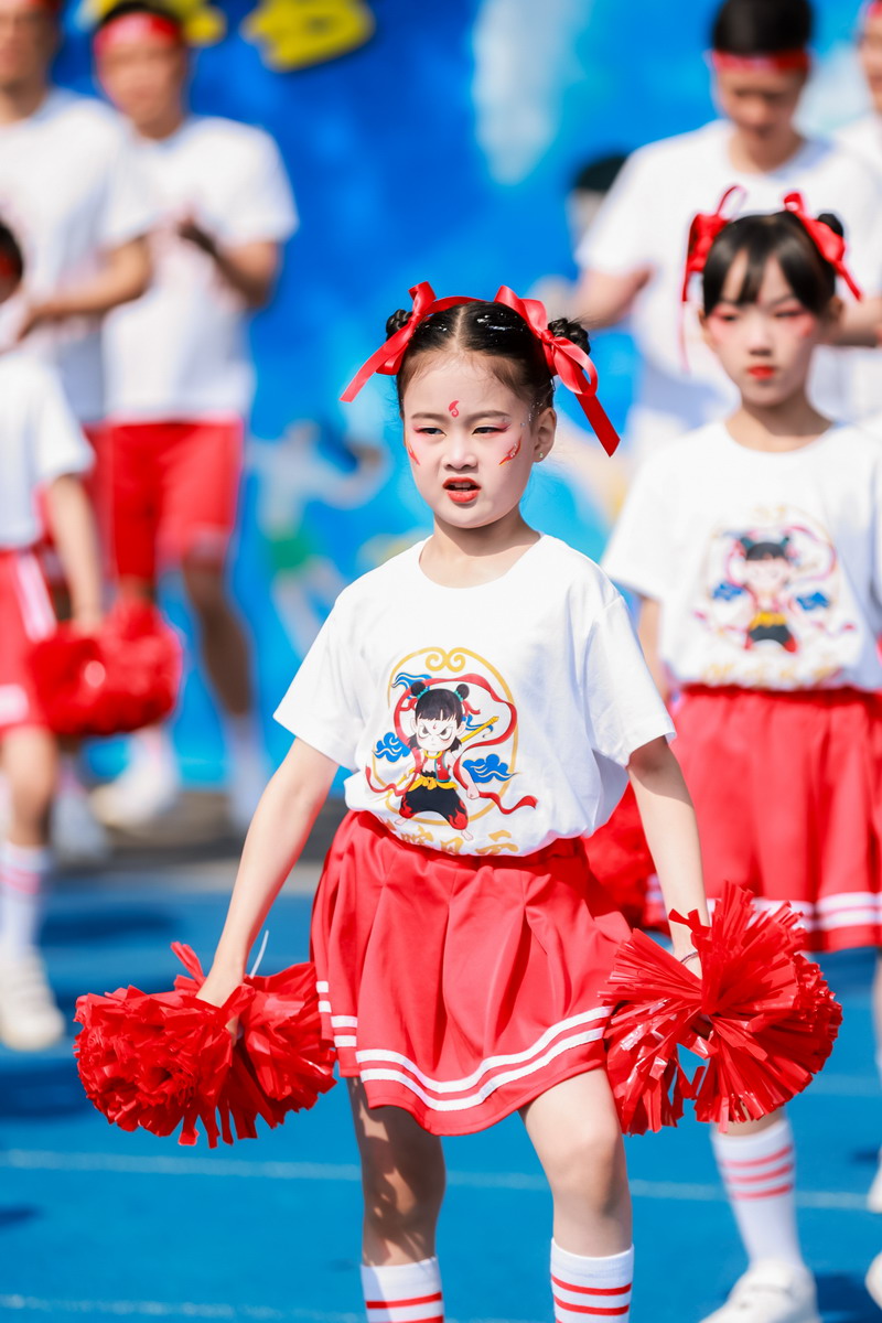 二 3 班“哪吒親子團(tuán)”:爸爸與孩子身披紅綢、手握烈焰,以“我命由我不由天”的氣勢(shì)登場(chǎng)。孩子們高舉紅色花球,如火焰般熾熱的少年志氣點(diǎn)燃全場(chǎng)。