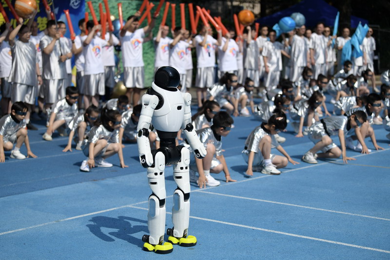 二 1 班 “未來(lái)科技隊(duì)”:銀色戰(zhàn)甲搭配流動(dòng)綢浪,爸爸們用臂膀擎起 “未來(lái)穹頂”,孩子們踩著“父愛(ài)云梯”,展現(xiàn)從積木火箭到量子計(jì)算機(jī)的科技?jí)粝耄蚴澜缧妗拔磥?lái)看我的”。