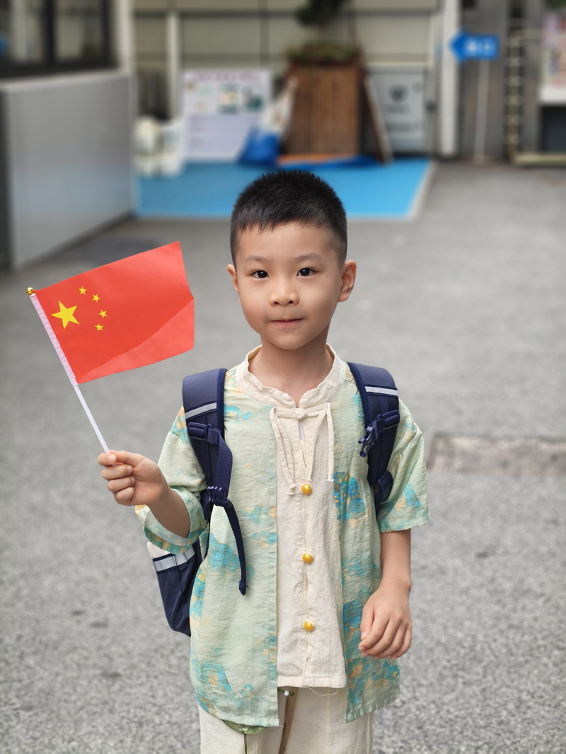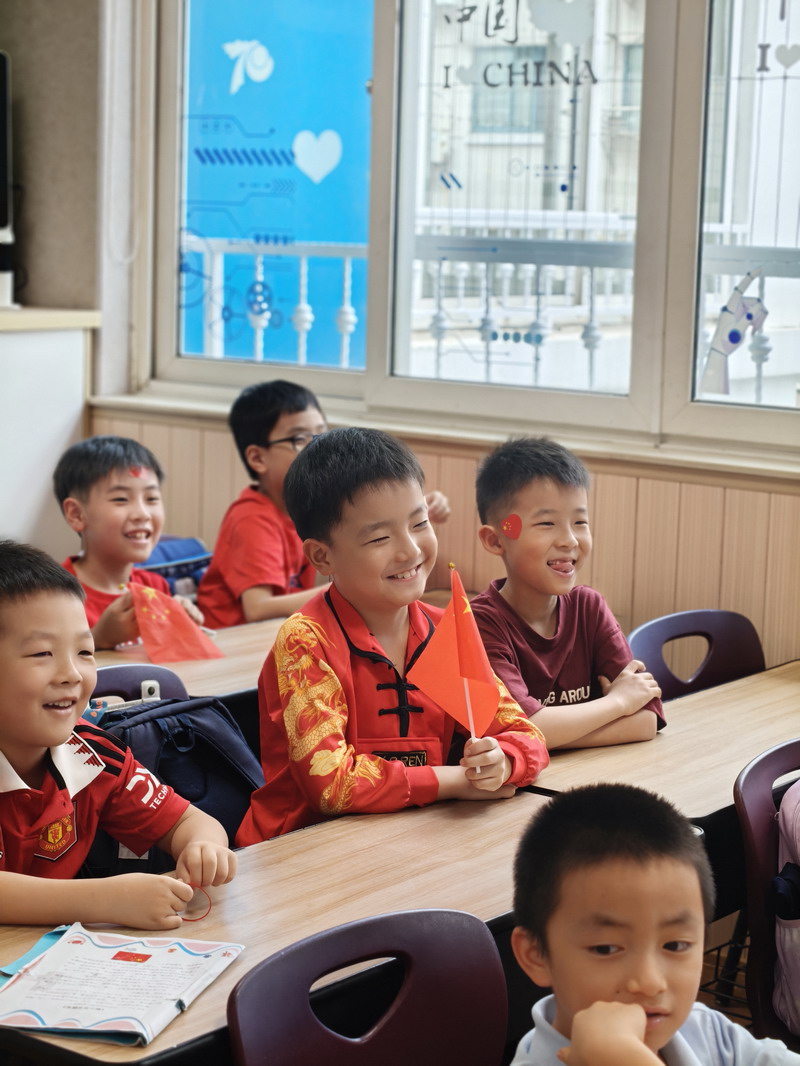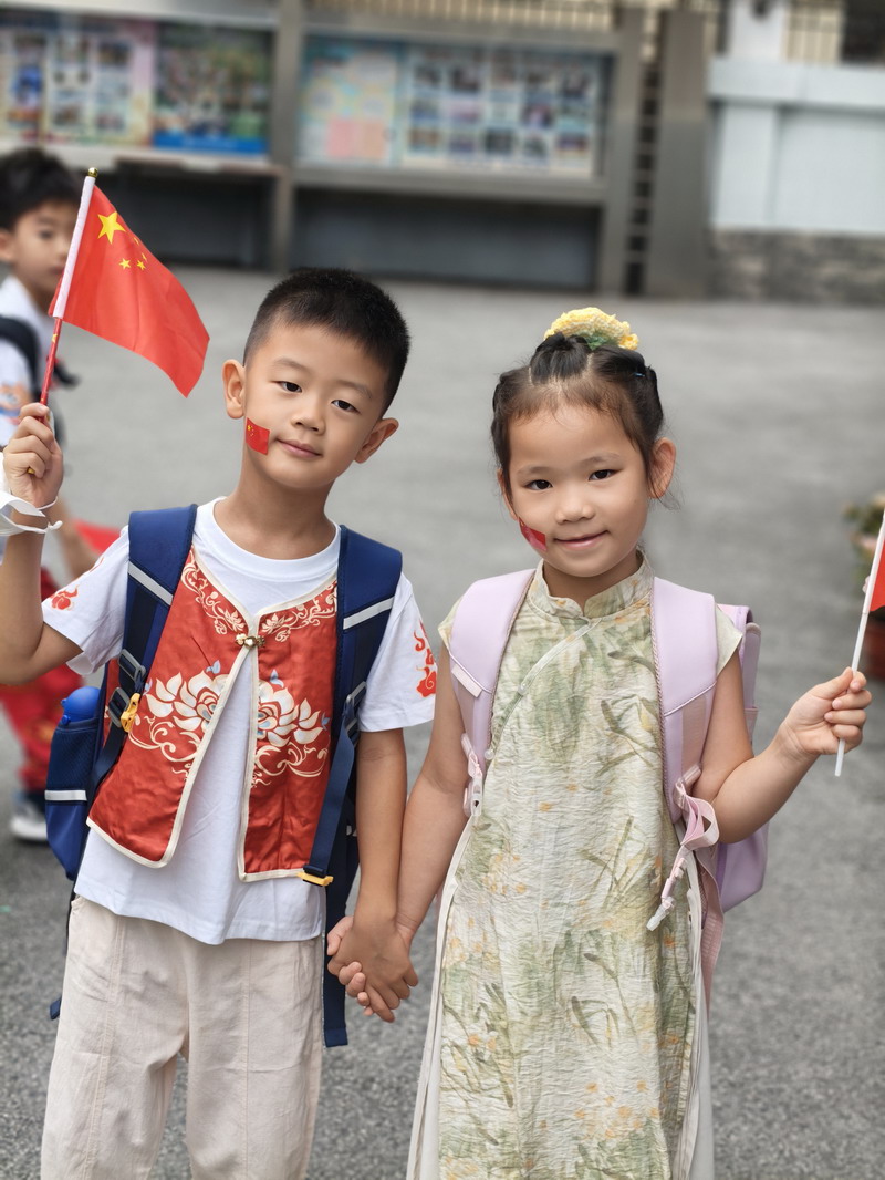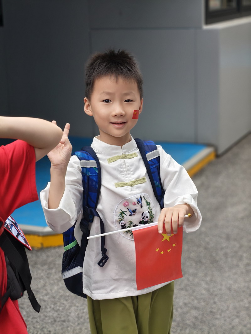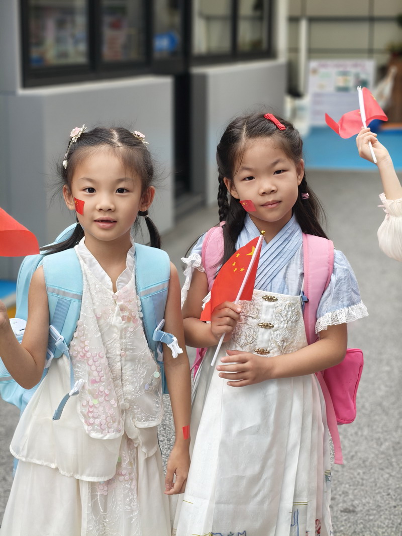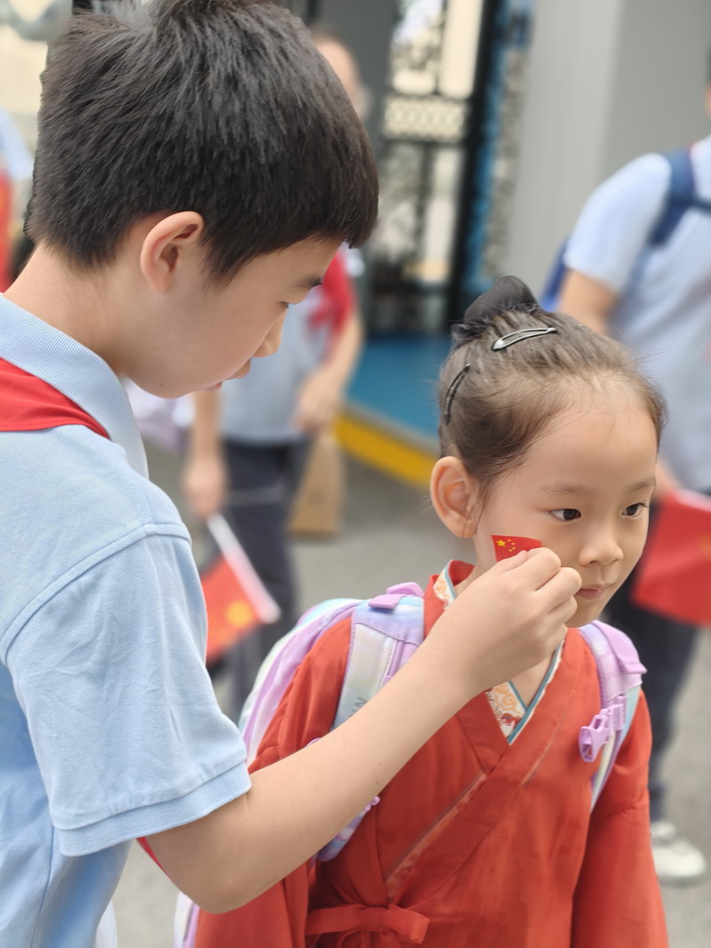 清晨,當第一縷陽光灑向校園,孩子們身著各式各樣的中式傳統服裝或點綴著鮮艷紅色元素的衣服,興高采烈地步入校門。男孩們的中山裝、盤扣上衣顯得精神抖擻,女孩們的旗袍、漢元素裙裝更顯溫婉可愛,那一抹抹躍動的“中國紅”,成為校園里最亮麗的風景線,彰顯著文化自信與民族自豪感。校門口,負責入校執勤的老師和學生志愿者早已準備就緒,他們微笑著向每一位同學問好,并遞上一面面小巧的五星紅旗和精美的愛國主題貼紙。孩子們接過國旗,小心翼翼地將貼紙貼在胸前或手背上,愛國情懷在這一遞一接、一貼一畫中悄然傳遞、深深烙印。