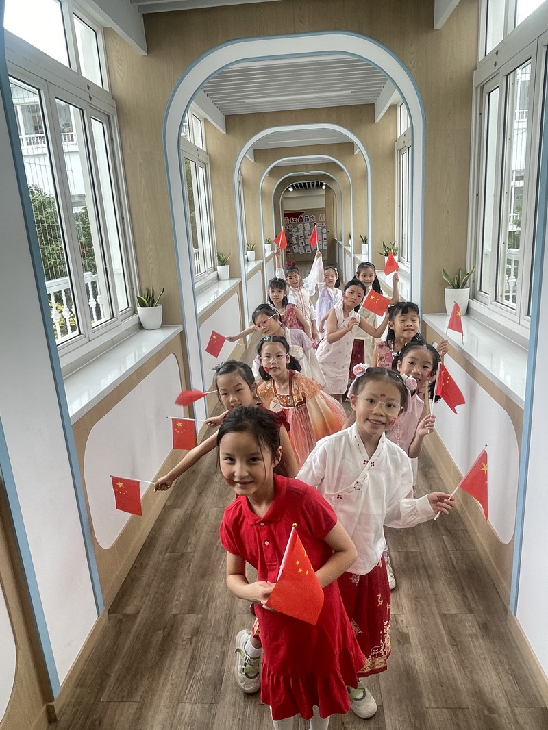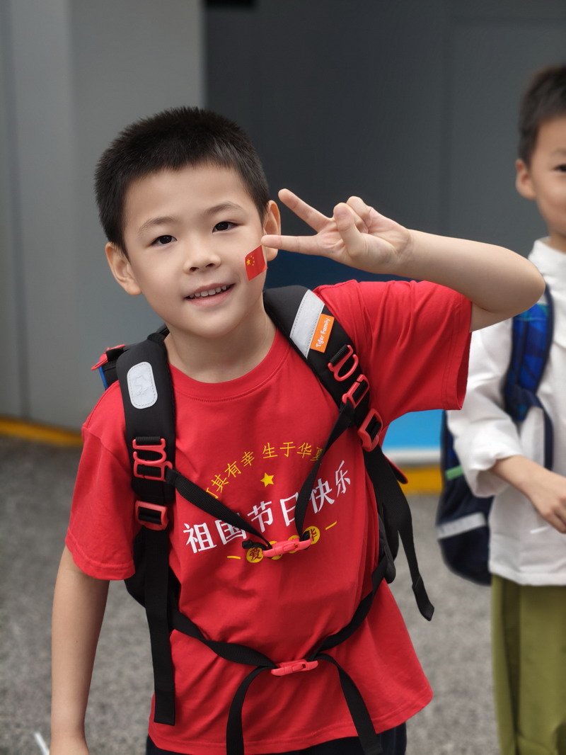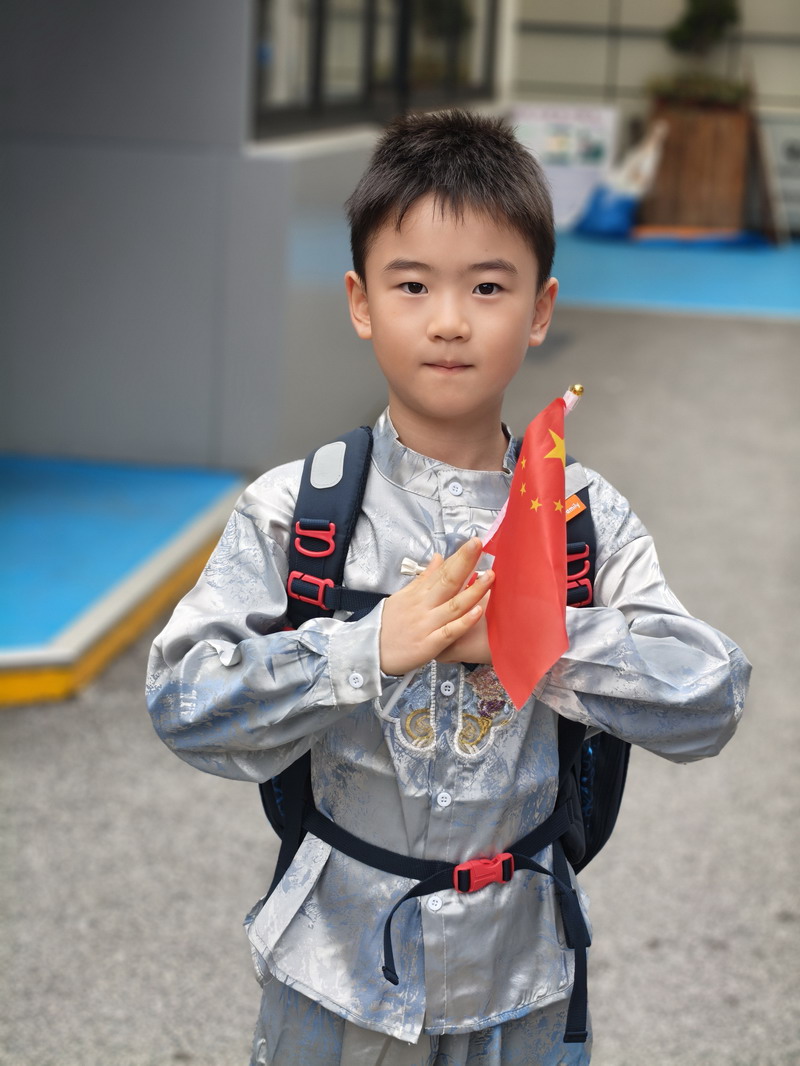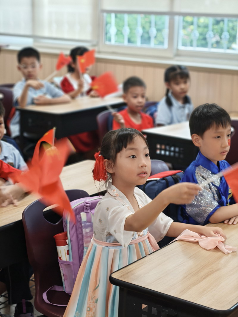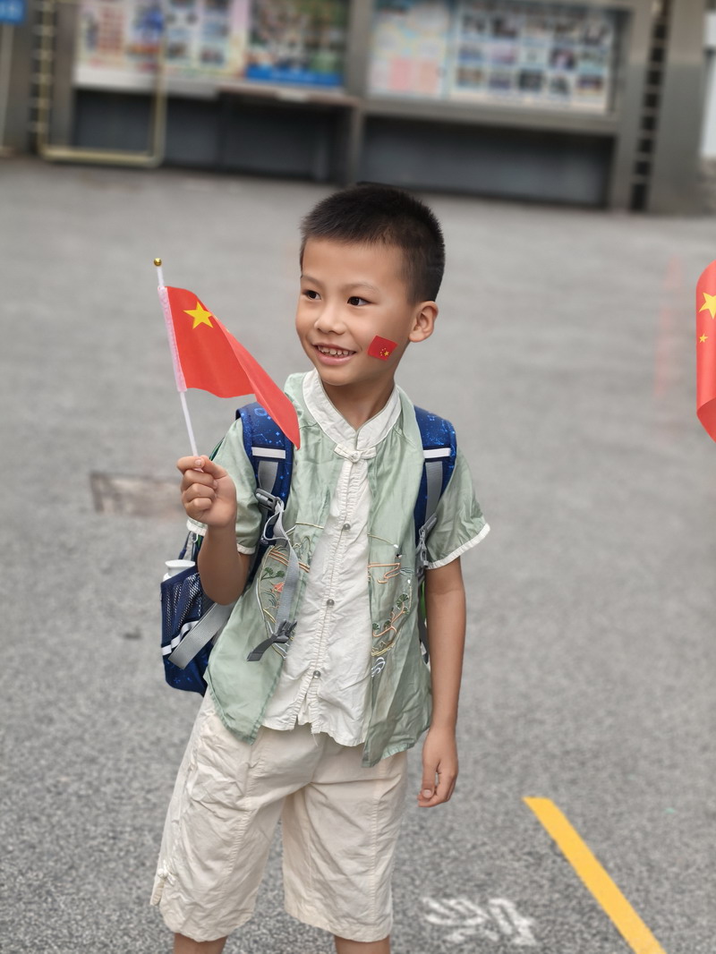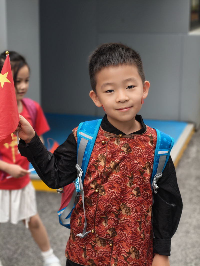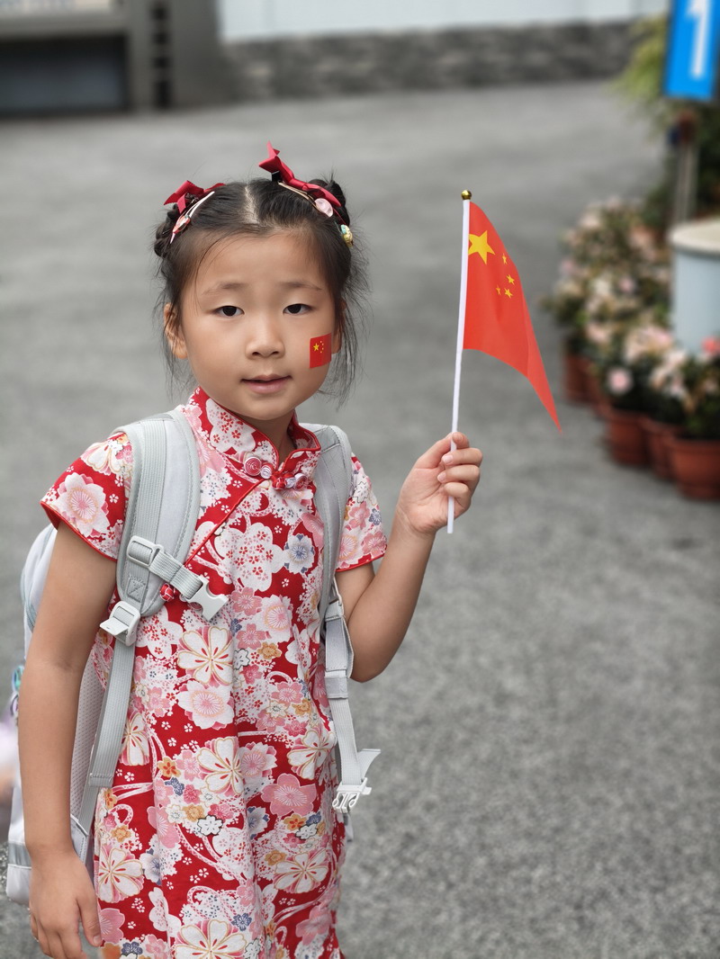 清晨,當第一縷陽光灑向校園,孩子們身著各式各樣的中式傳統服裝或點綴著鮮艷紅色元素的衣服,興高采烈地步入校門。男孩們的中山裝、盤扣上衣顯得精神抖擻,女孩們的旗袍、漢元素裙裝更顯溫婉可愛,那一抹抹躍動的“中國紅”,成為校園里最亮麗的風景線,彰顯著文化自信與民族自豪感。校門口,負責入校執勤的老師和學生志愿者早已準備就緒,他們微笑著向每一位同學問好,并遞上一面面小巧的五星紅旗和精美的愛國主題貼紙。孩子們接過國旗,小心翼翼地將貼紙貼在胸前或手背上,愛國情懷在這一遞一接、一貼一畫中悄然傳遞、深深烙印。