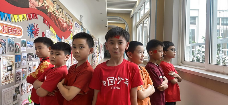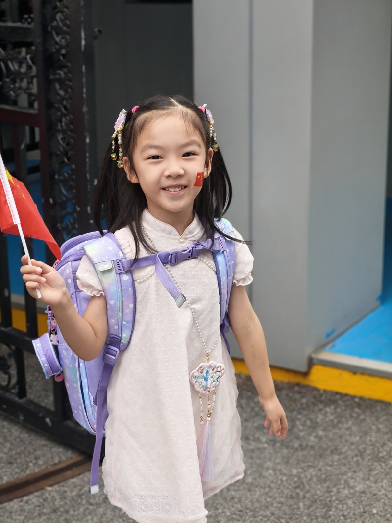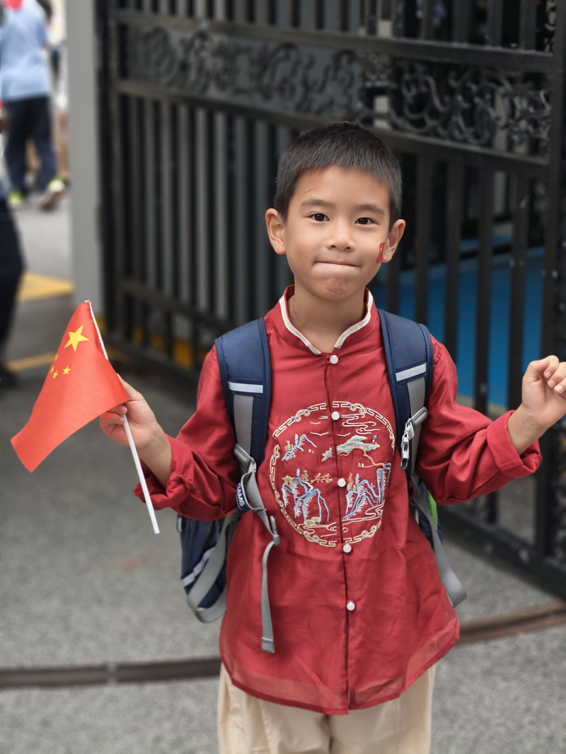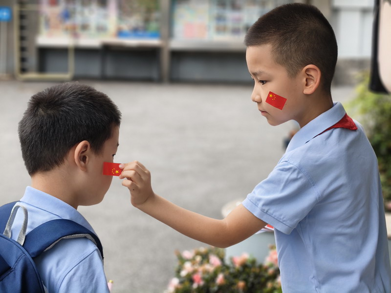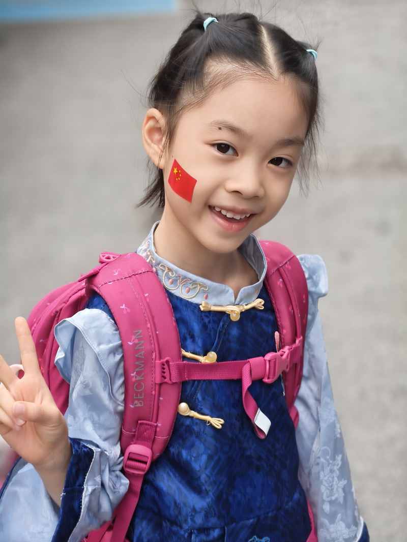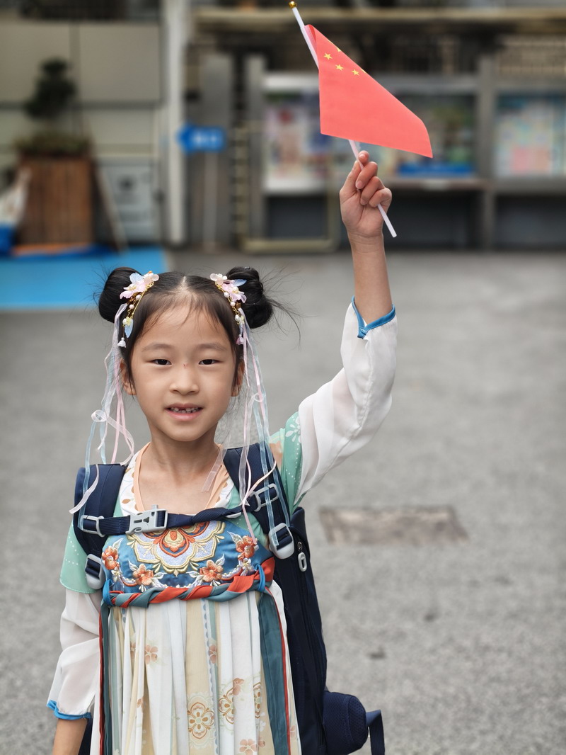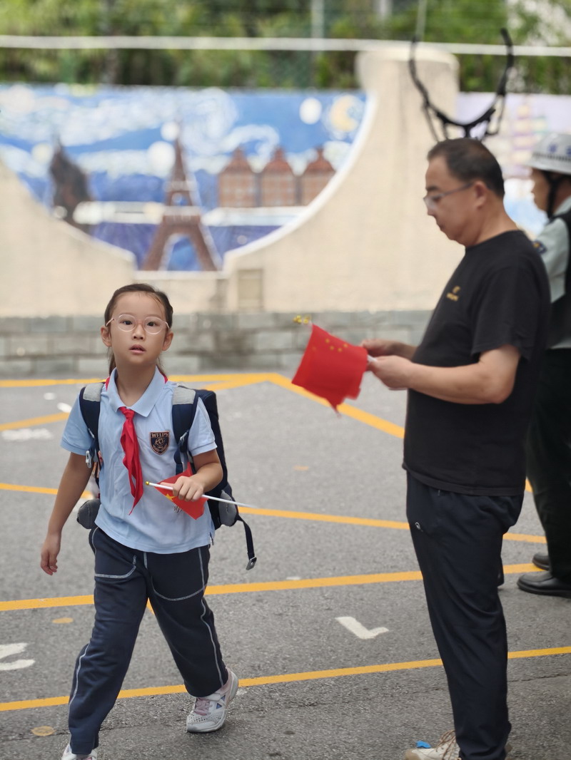 清晨,當第一縷陽光灑向校園,孩子們身著各式各樣的中式傳統服裝或點綴著鮮艷紅色元素的衣服,興高采烈地步入校門。男孩們的中山裝、盤扣上衣顯得精神抖擻,女孩們的旗袍、漢元素裙裝更顯溫婉可愛,那一抹抹躍動的“中國紅”,成為校園里最亮麗的風景線,彰顯著文化自信與民族自豪感。校門口,負責入校執勤的老師和學生志愿者早已準備就緒,他們微笑著向每一位同學問好,并遞上一面面小巧的五星紅旗和精美的愛國主題貼紙。孩子們接過國旗,小心翼翼地將貼紙貼在胸前或手背上,愛國情懷在這一遞一接、一貼一畫中悄然傳遞、深深烙印。