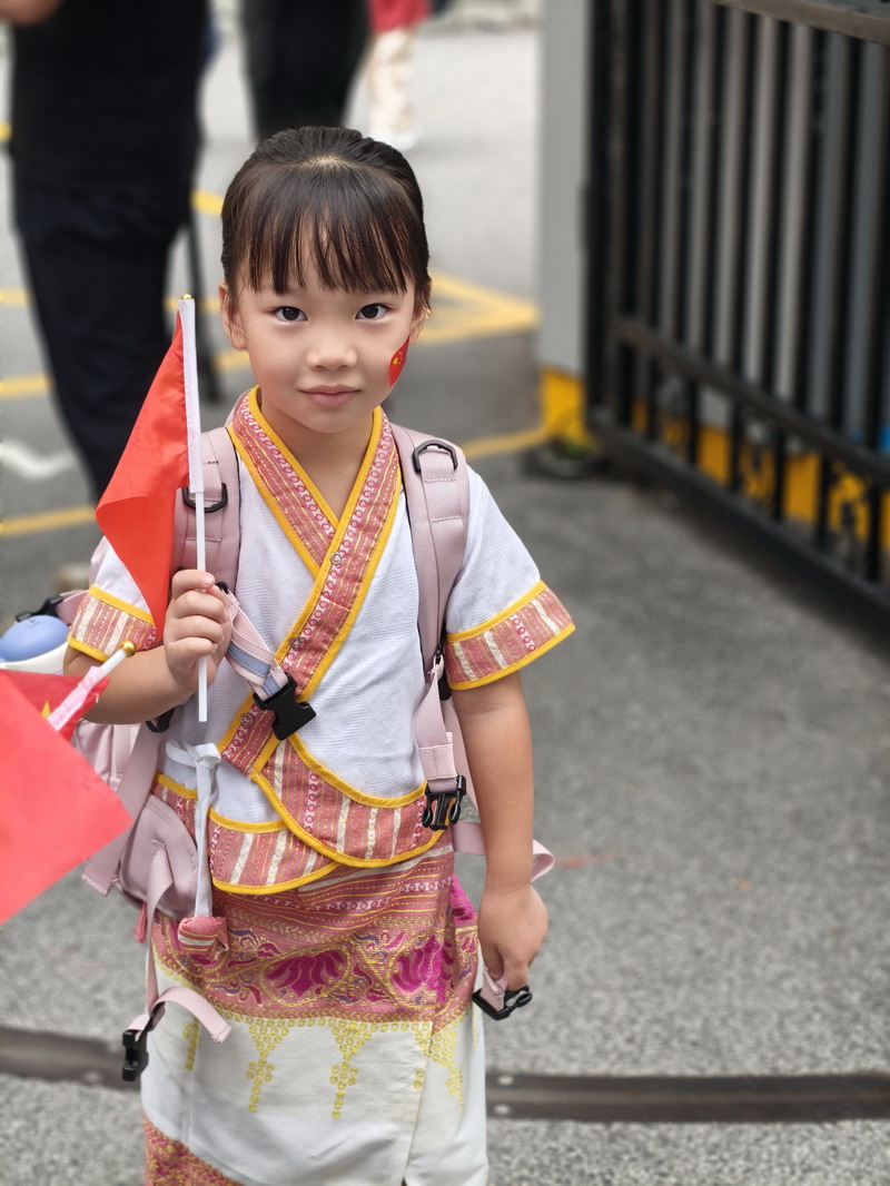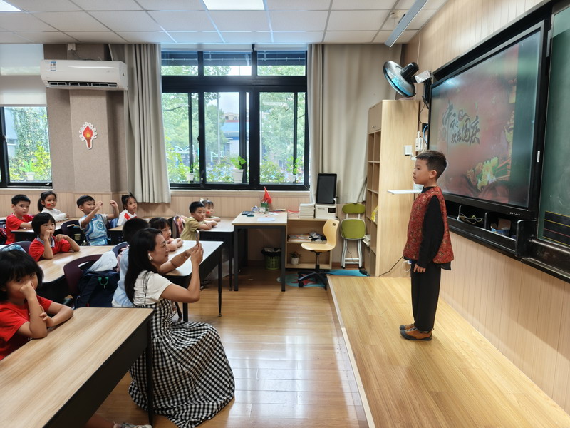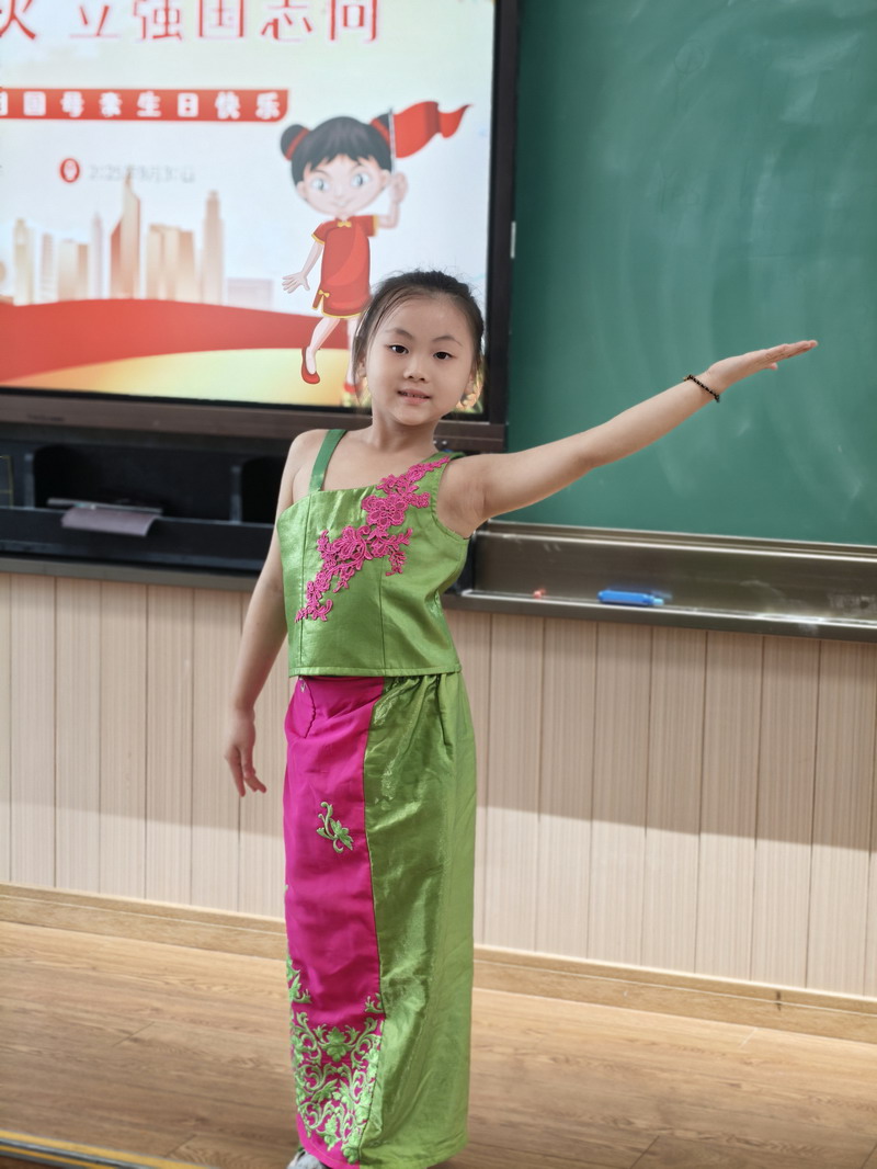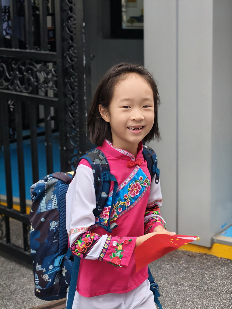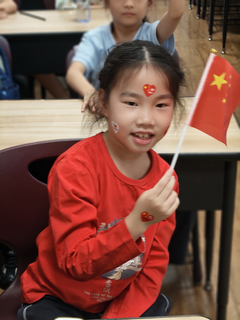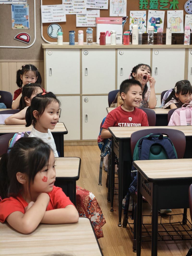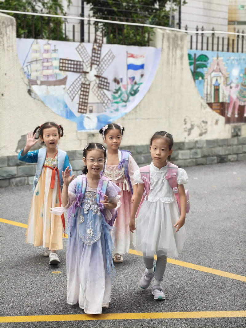 清晨,當第一縷陽光灑向校園,孩子們身著各式各樣的中式傳統服裝或點綴著鮮艷紅色元素的衣服,興高采烈地步入校門。男孩們的中山裝、盤扣上衣顯得精神抖擻,女孩們的旗袍、漢元素裙裝更顯溫婉可愛,那一抹抹躍動的“中國紅”,成為校園里最亮麗的風景線,彰顯著文化自信與民族自豪感。校門口,負責入校執勤的老師和學生志愿者早已準備就緒,他們微笑著向每一位同學問好,并遞上一面面小巧的五星紅旗和精美的愛國主題貼紙。孩子們接過國旗,小心翼翼地將貼紙貼在胸前或手背上,愛國情懷在這一遞一接、一貼一畫中悄然傳遞、深深烙印。
