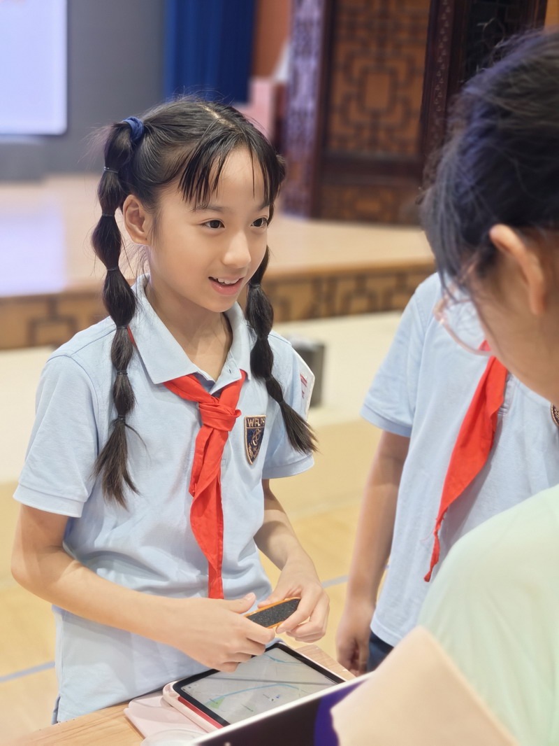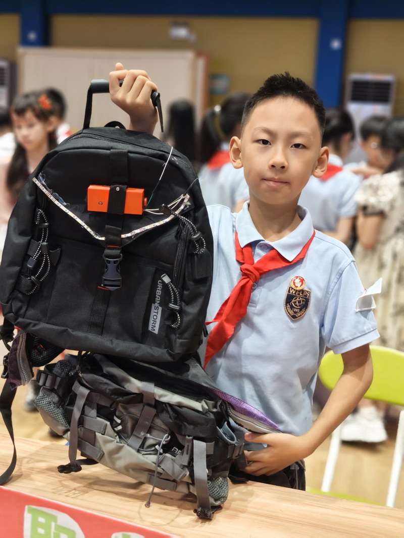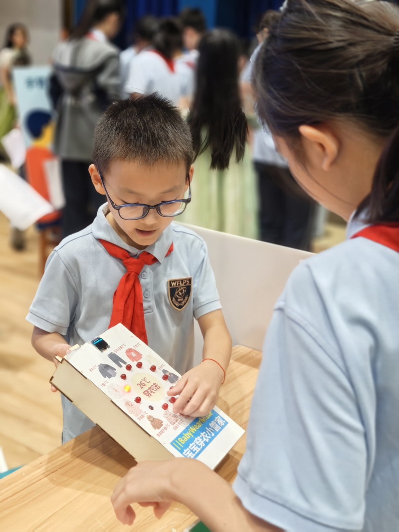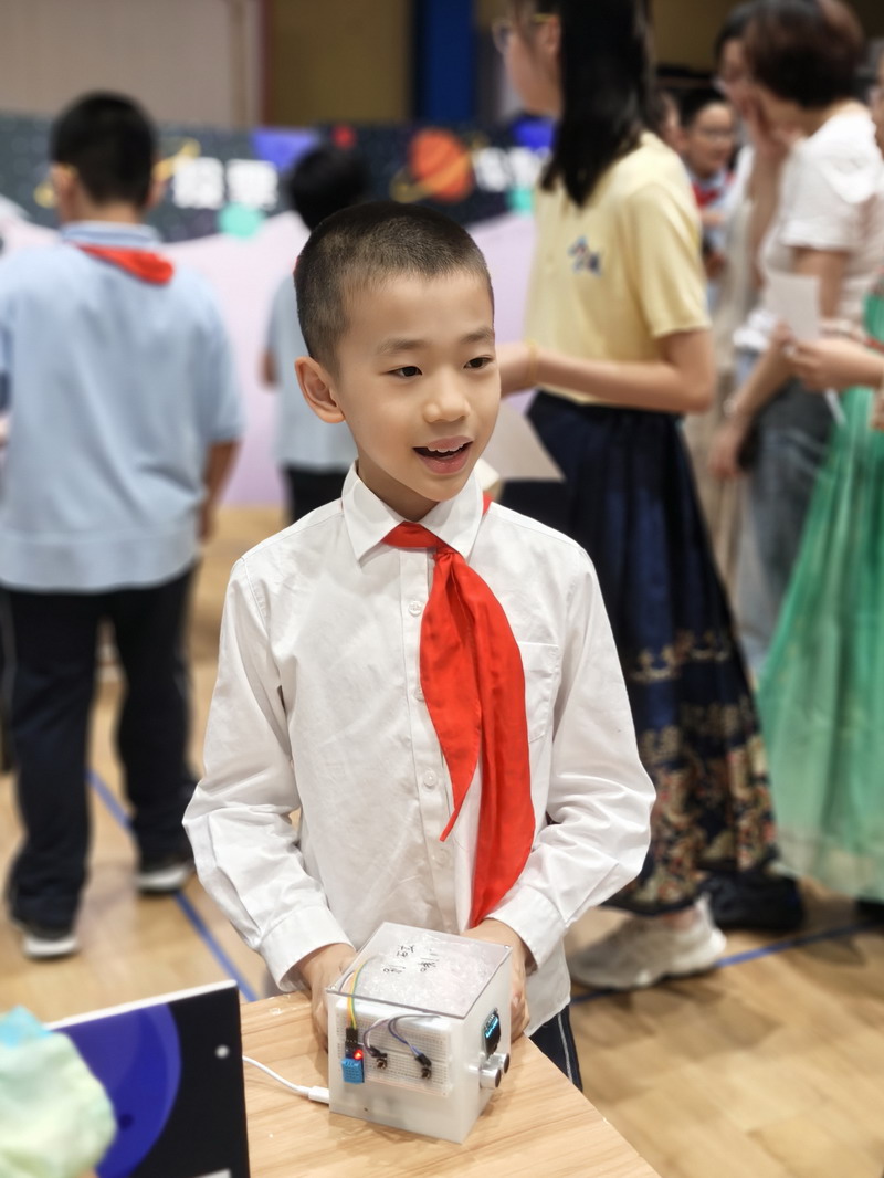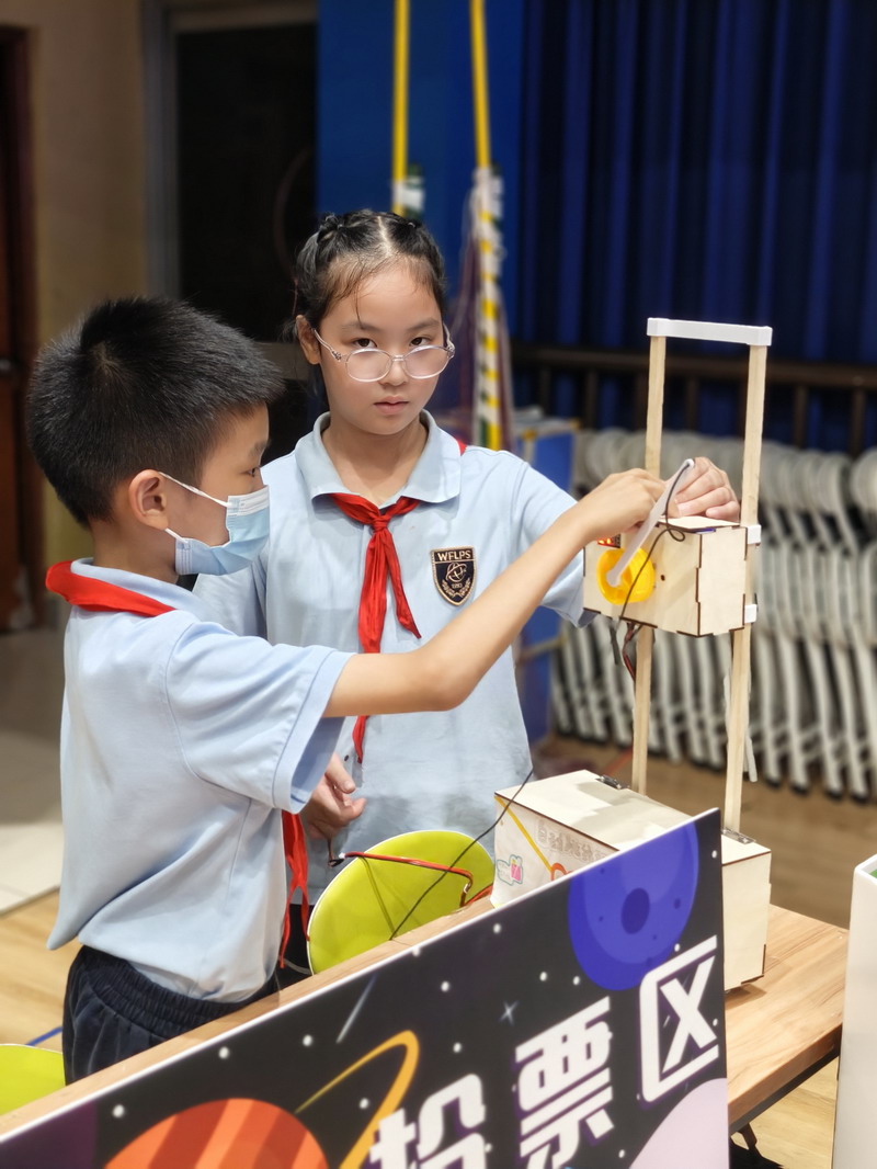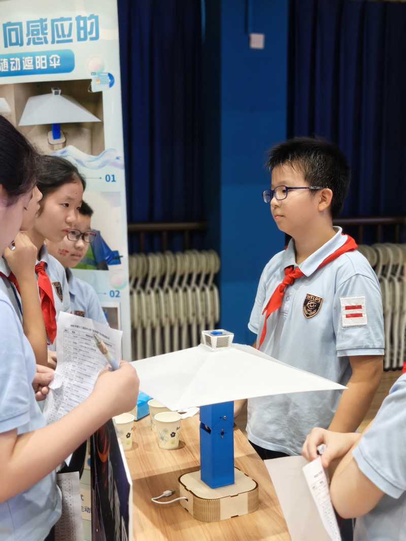 此次國慶活動結合“奇思妙想”校長獎,邀請三至五年級學生參觀科創選手的作品。在學校精心布置的展廳里,陳列著眾多在“奇思妙想”校長獎評選中的優秀科創作品。這些小發明、小制作、研究報告,凝聚了世外小學子們的智慧與探索精神。從節能環保的巧妙設計,到智能家居的初步構想;從對生命科學的稚嫩探問,到對人工智能的大膽嘗試……每一件作品都閃耀著創新思維的火花。同學們在老師的組織和引導下,有序地觀摩各個展臺,認真聆聽小講解員的介紹,不時發出贊嘆,提出自己的疑問,并為喜歡的作品投票。這場科創盛宴,極大地激發了孩子們的好奇心和求知欲,讓他們深刻體會到“科技是第一生產力”的內涵,將“承紅色薪火”與“立強國志向”落到實處,激勵他們從小熱愛科學、勇于創新,立志為祖國的科技強國事業貢獻智慧。