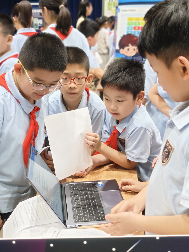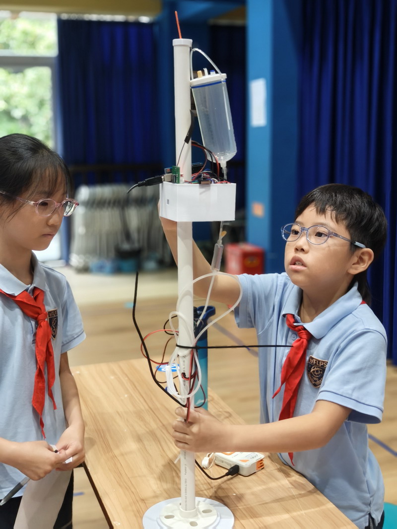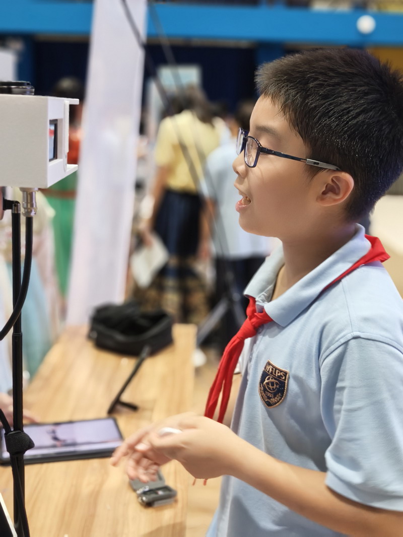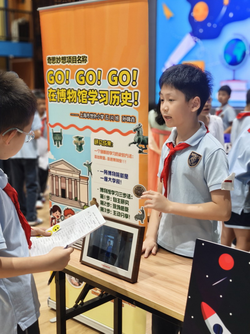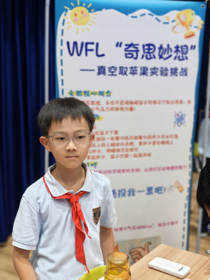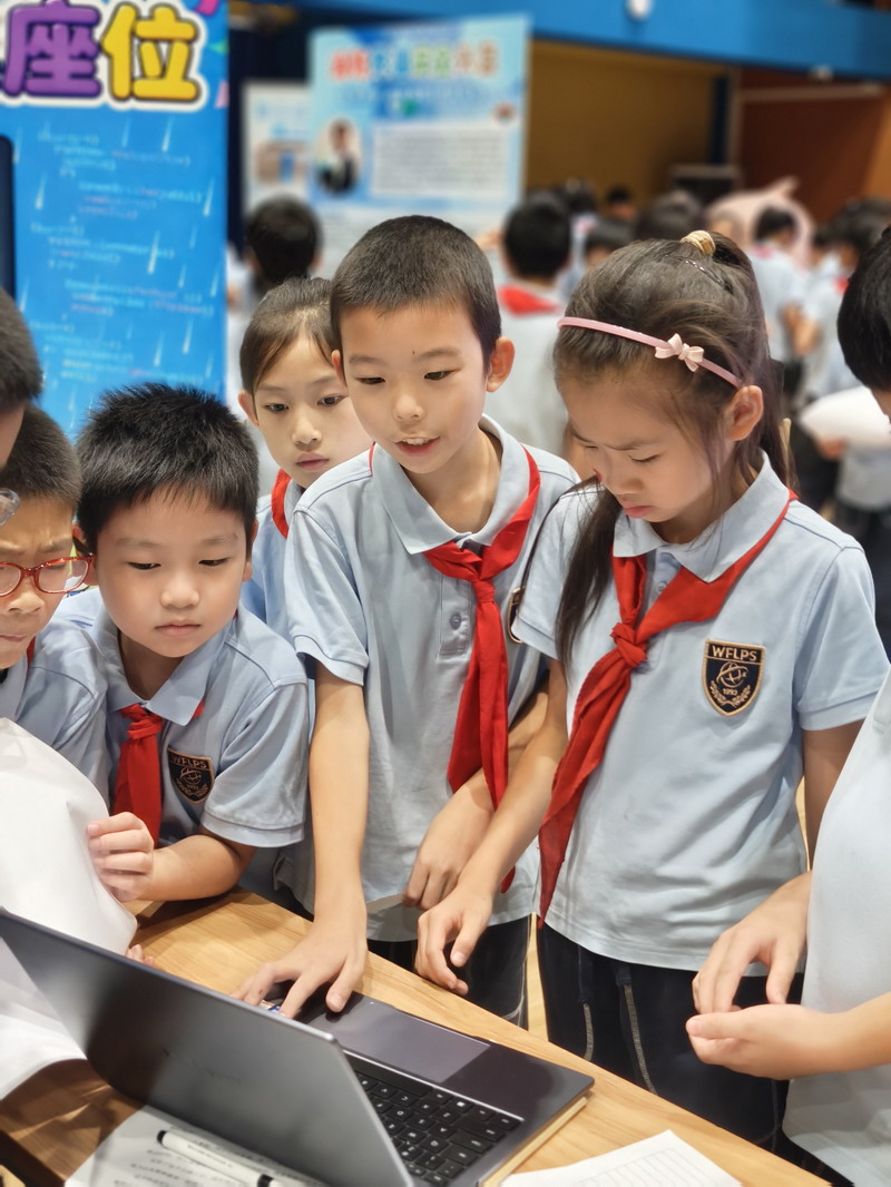 此次國慶活動結合“奇思妙想”校長獎,邀請三至五年級學生參觀科創選手的作品。在學校精心布置的展廳里,陳列著眾多在“奇思妙想”校長獎評選中的優秀科創作品。這些小發明、小制作、研究報告,凝聚了世外小學子們的智慧與探索精神。從節能環保的巧妙設計,到智能家居的初步構想;從對生命科學的稚嫩探問,到對人工智能的大膽嘗試……每一件作品都閃耀著創新思維的火花。同學們在老師的組織和引導下,有序地觀摩各個展臺,認真聆聽小講解員的介紹,不時發出贊嘆,提出自己的疑問,并為喜歡的作品投票。這場科創盛宴,極大地激發了孩子們的好奇心和求知欲,讓他們深刻體會到“科技是第一生產力”的內涵,將“承紅色薪火”與“立強國志向”落到實處,激勵他們從小熱愛科學、勇于創新,立志為祖國的科技強國事業貢獻智慧。