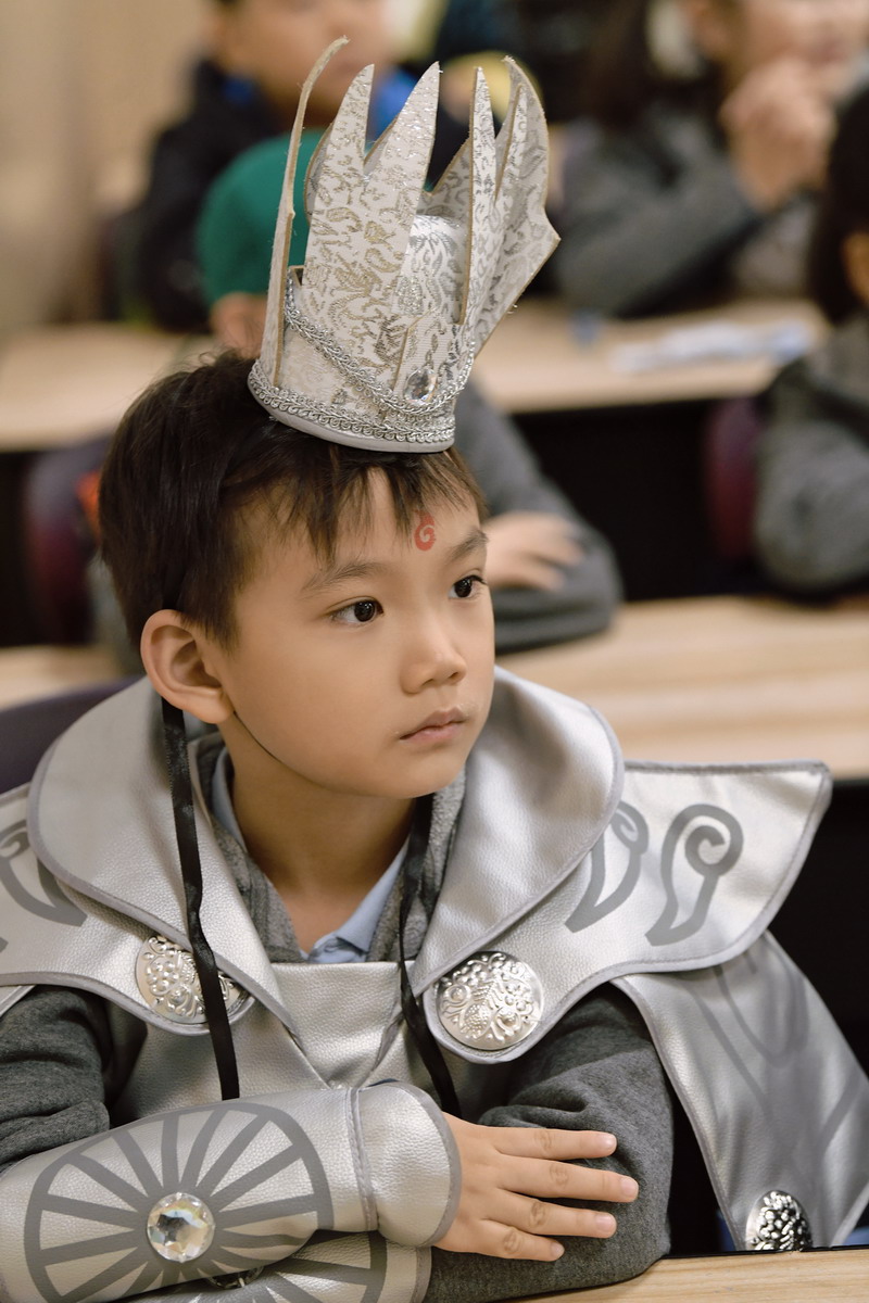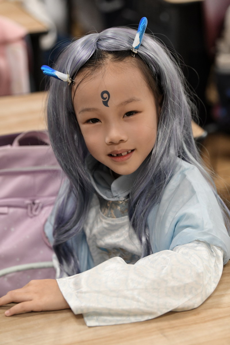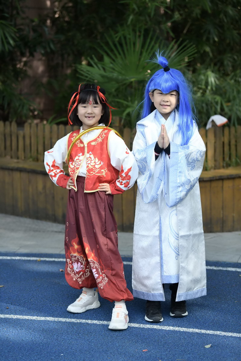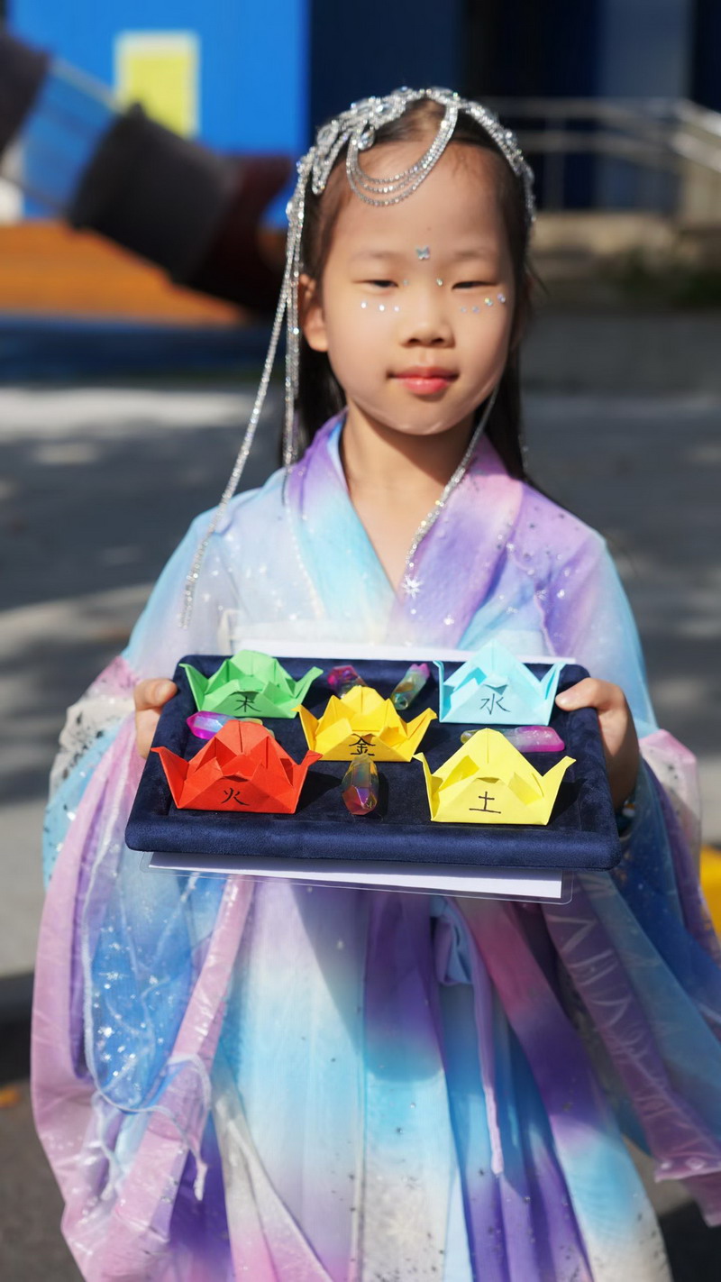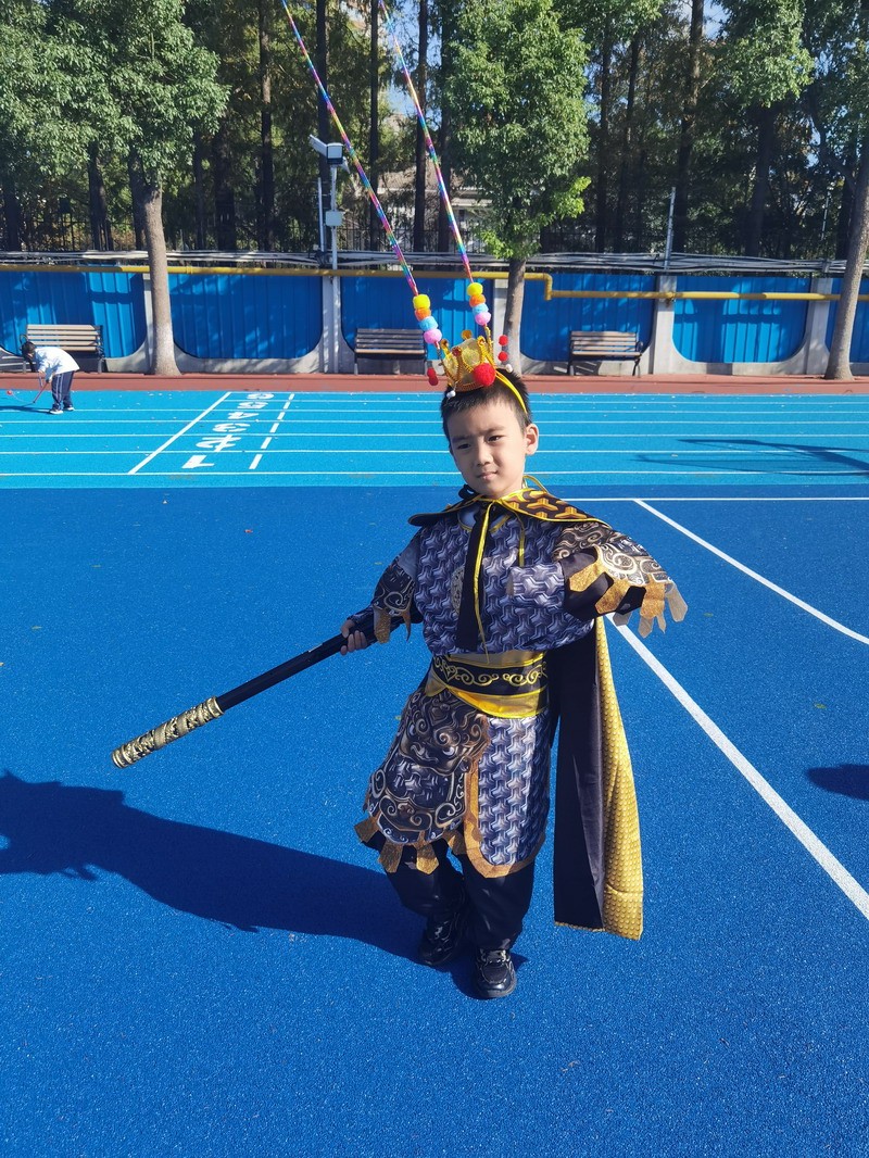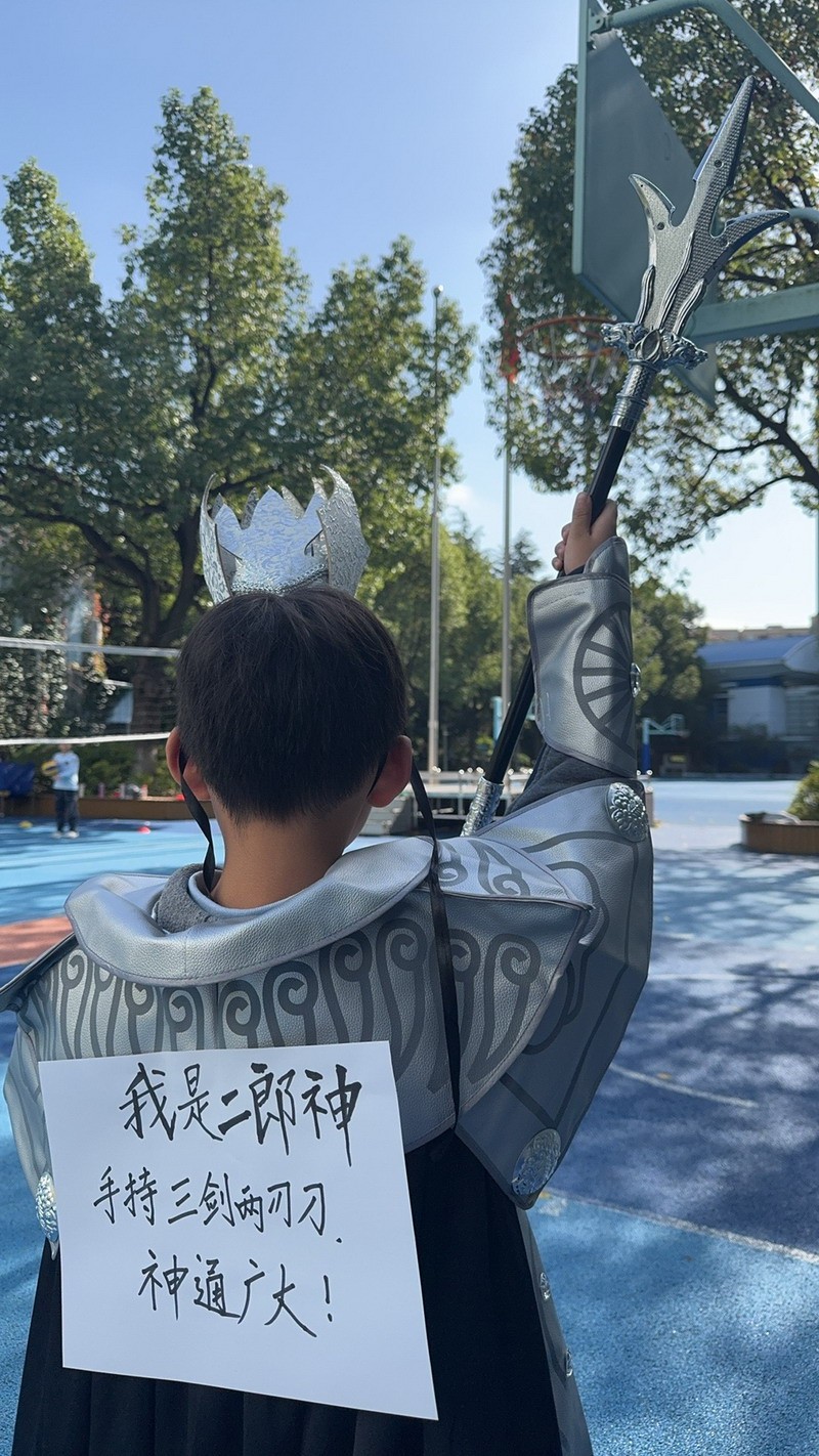 升旗儀式結束后,故事的帷幕拉開,孩子們便踏上了一趟奇妙的英雄之旅。那一刻,教室和操場變成了任想象力馳騁的廣闊天地——有的孩子披上光芒,成了追逐太陽的夸父,步伐堅定;有的孩子掌心向上,成了煉石補天的女媧,心懷蒼生。